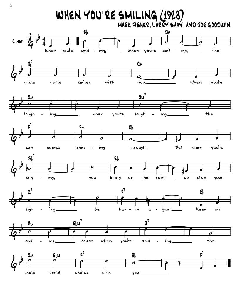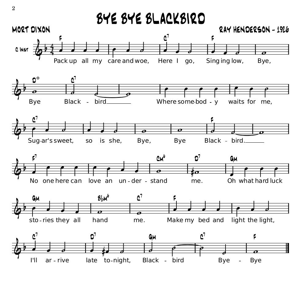 Lead sheets serve as a basic outline for the band. They show a rough estimate of the melody of the song, a key signature, a time signature, along with basic letters indicating chord progressions. Most lead sheets look similar to the following examples.